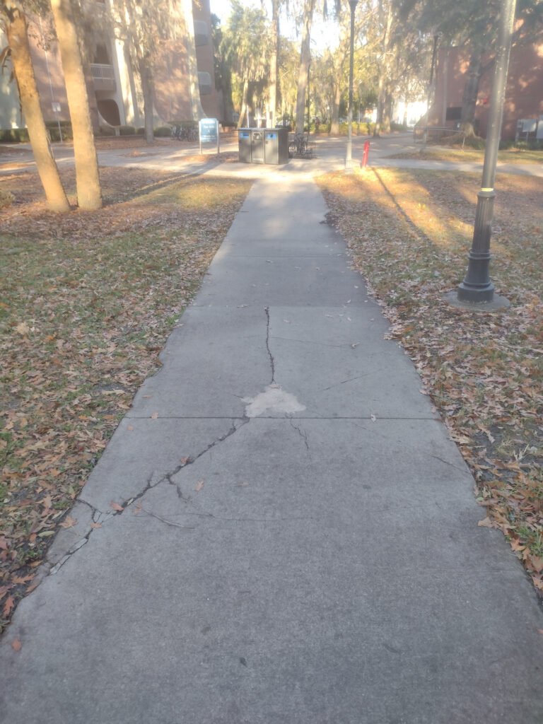 Sidewalk up to Fine Arts Sign has a hole that has been filled