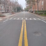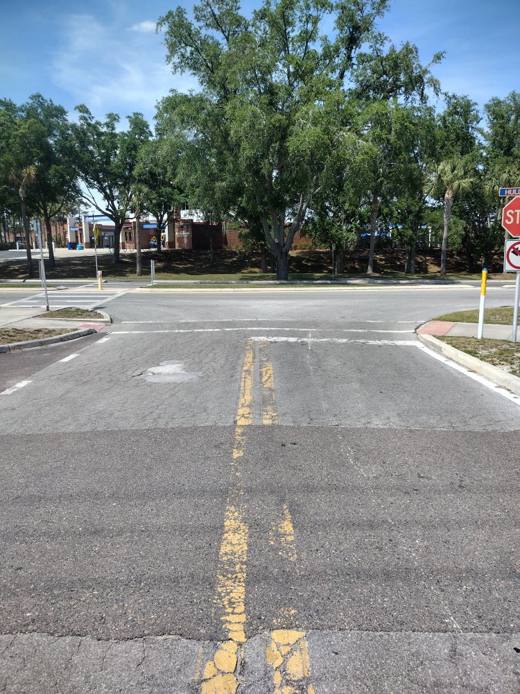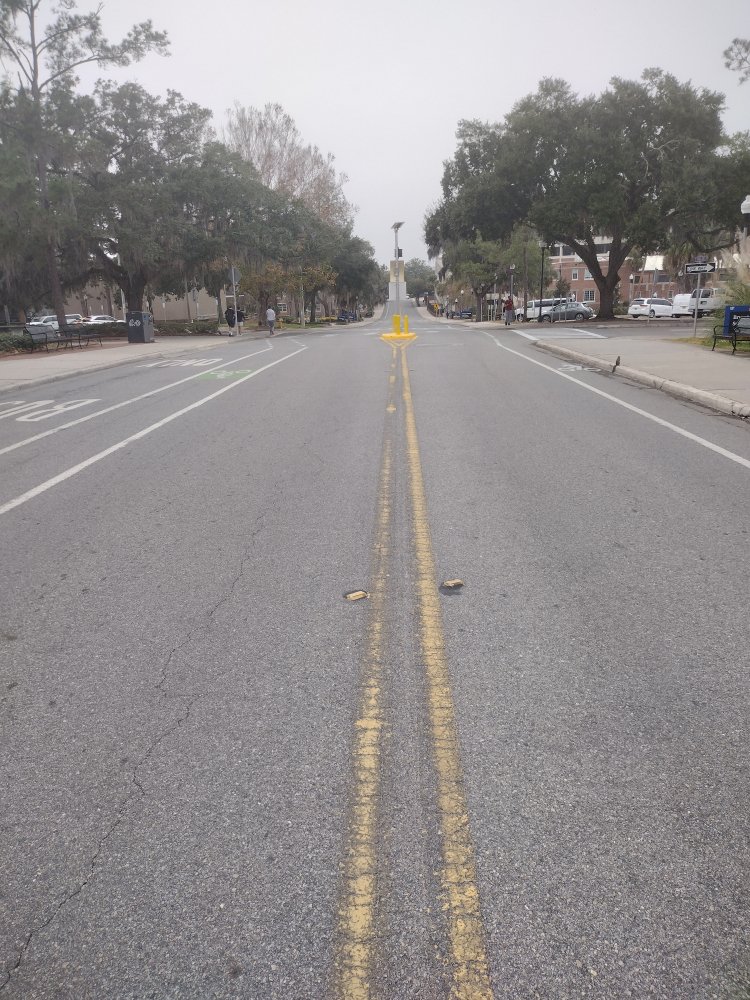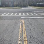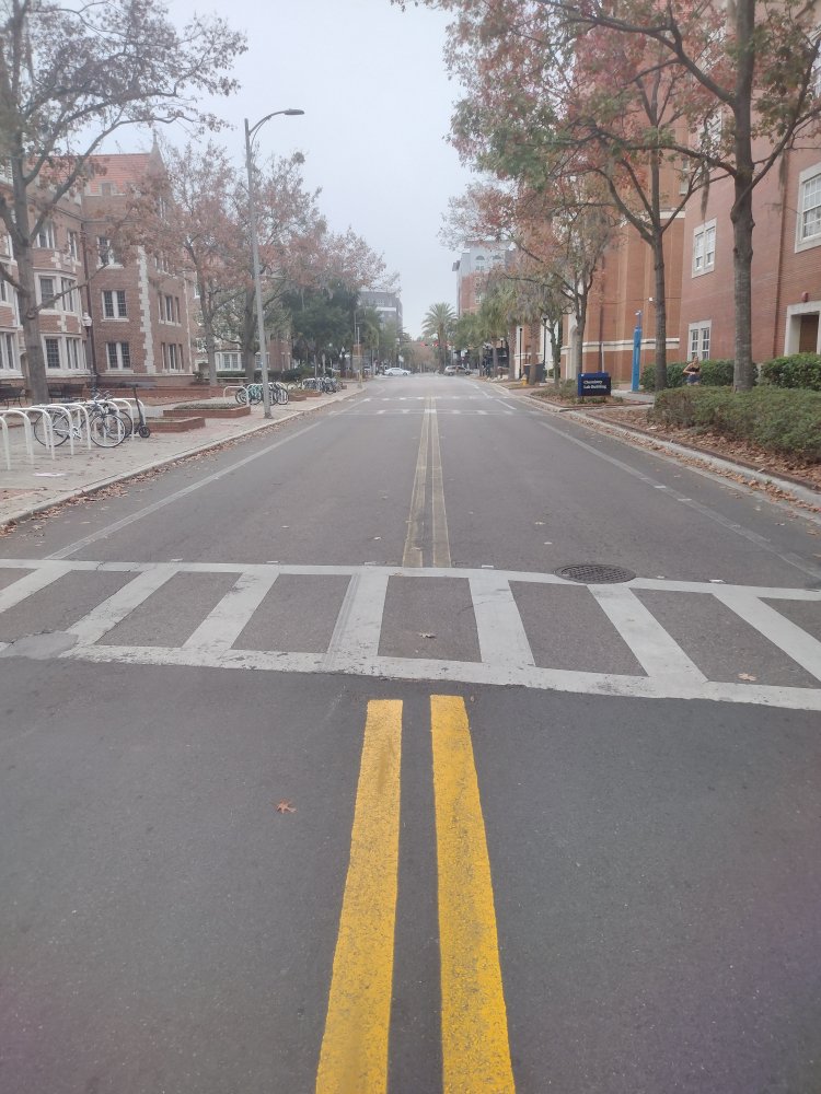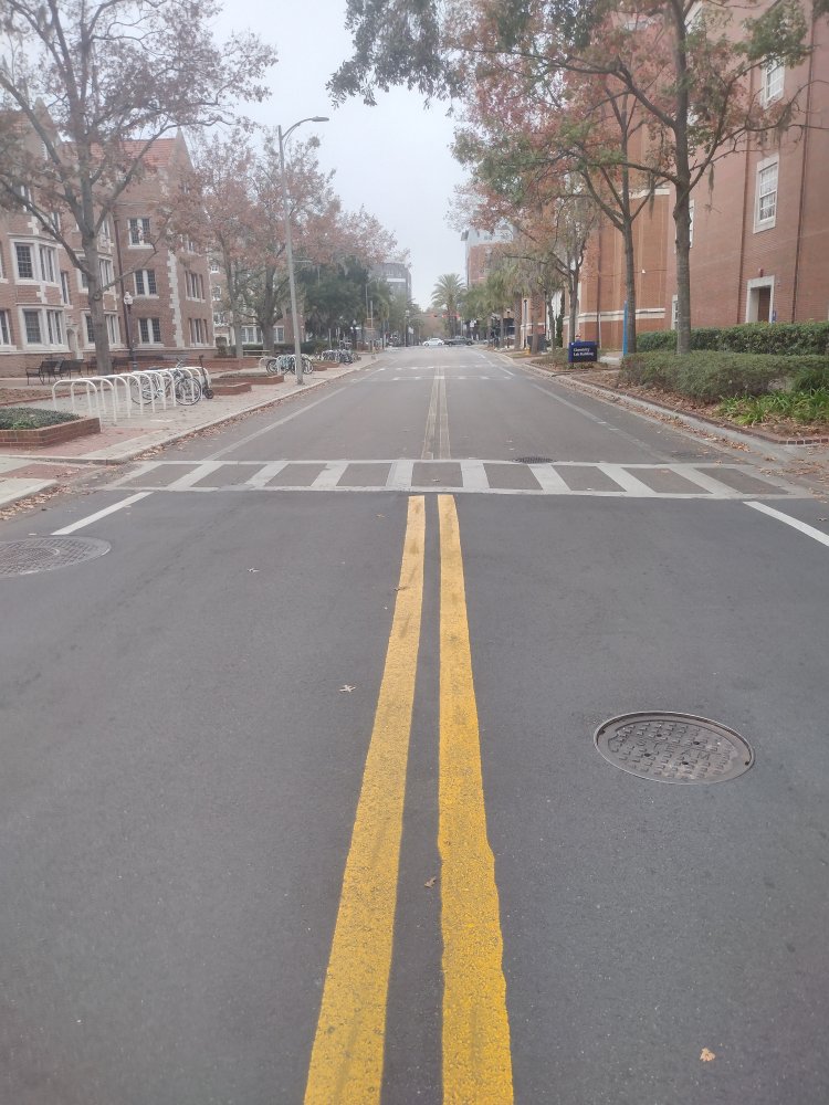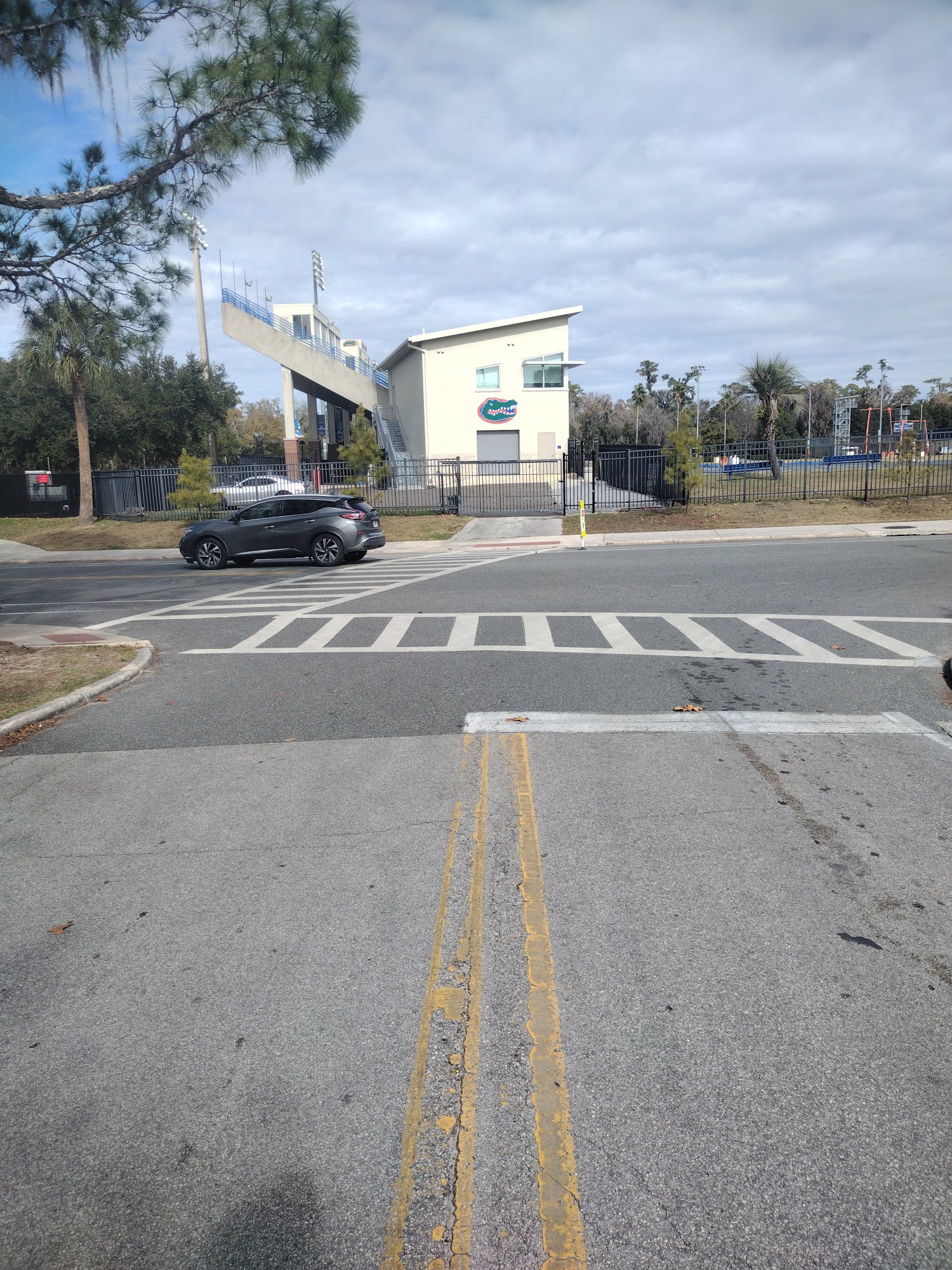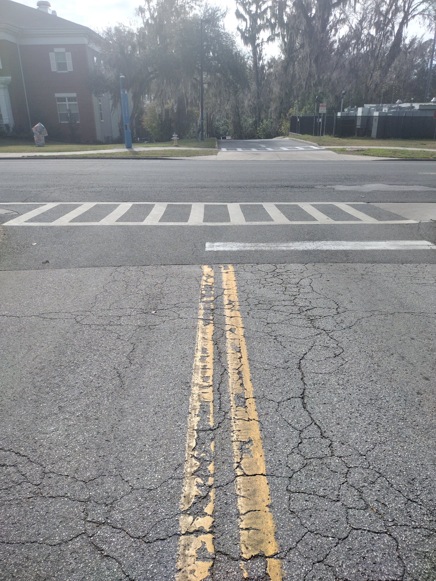 The lines were not finished toward the stop sign. The crosswalks were done, yet not the yellow lines. Tens of thousands of people use that area every Spring semester because of the sporting events.