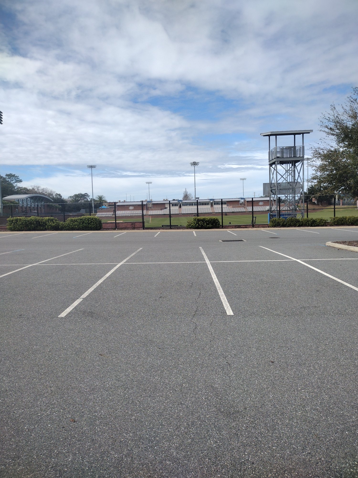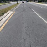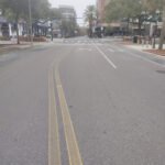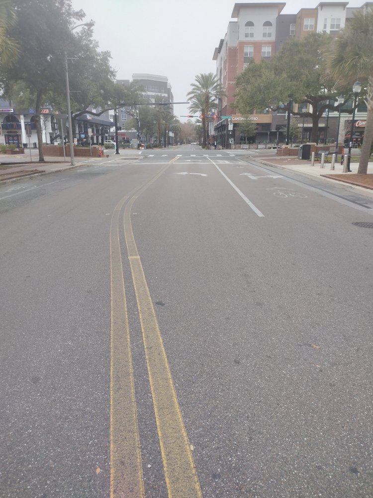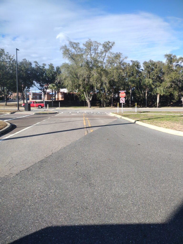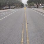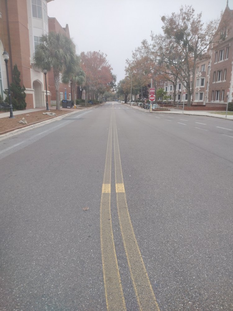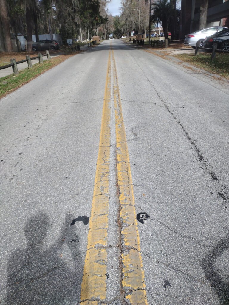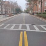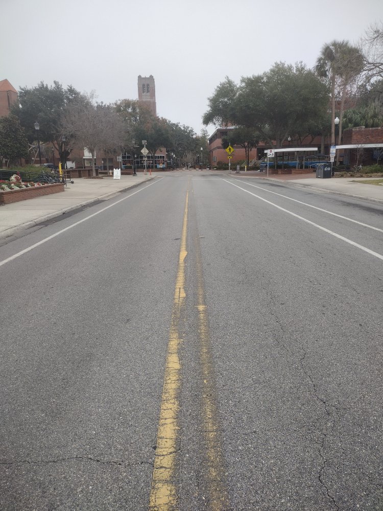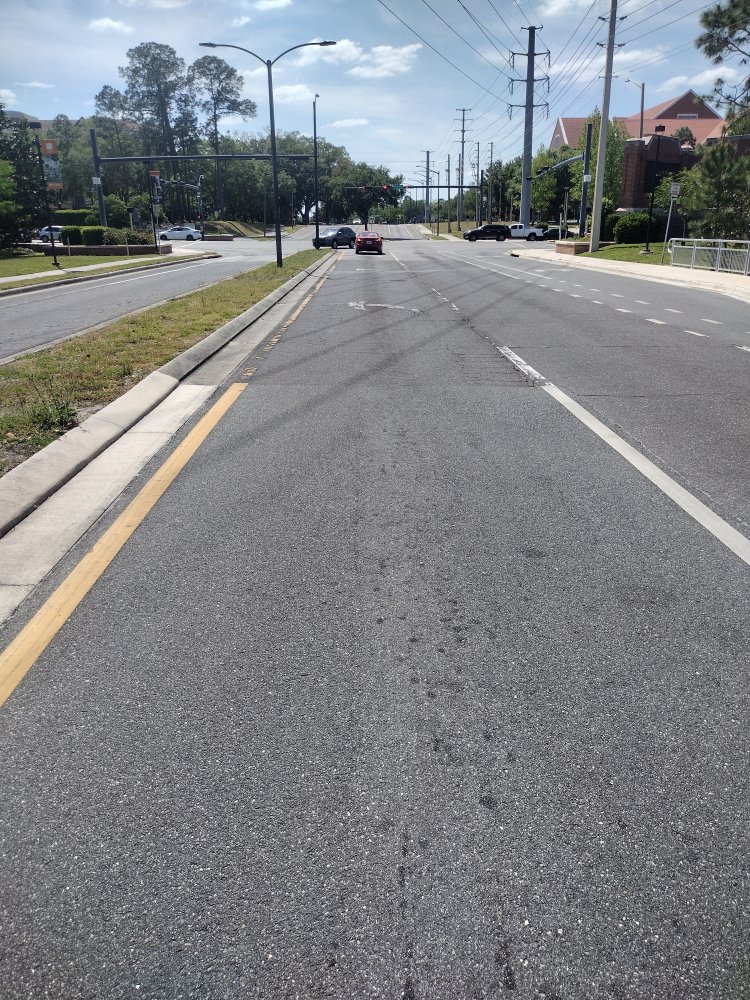 The lines were not finished toward the stop sign. The crosswalks were done, yet not the yellow lines. Tens of thousands of people use that area every Spring semester because of the sporting events.