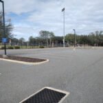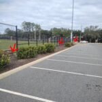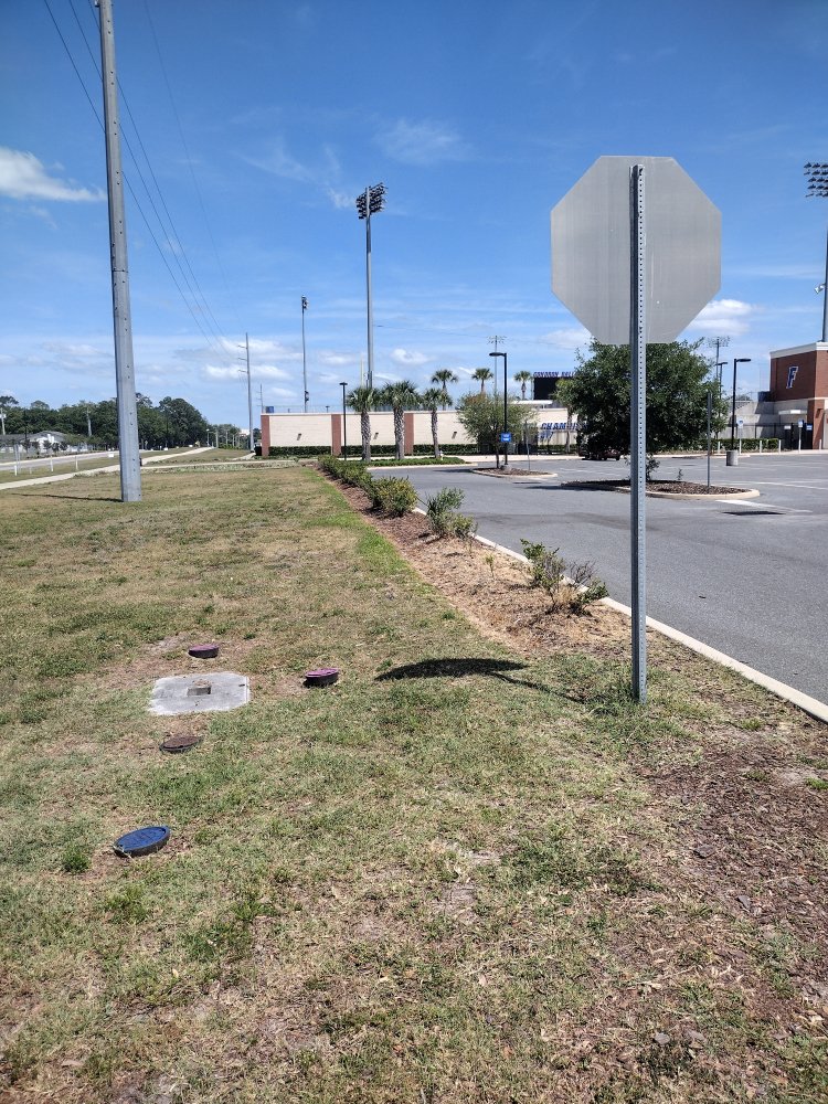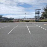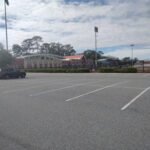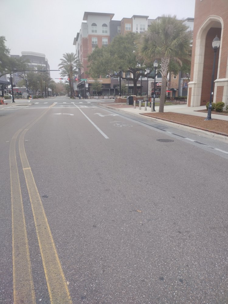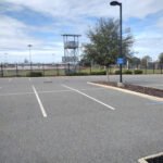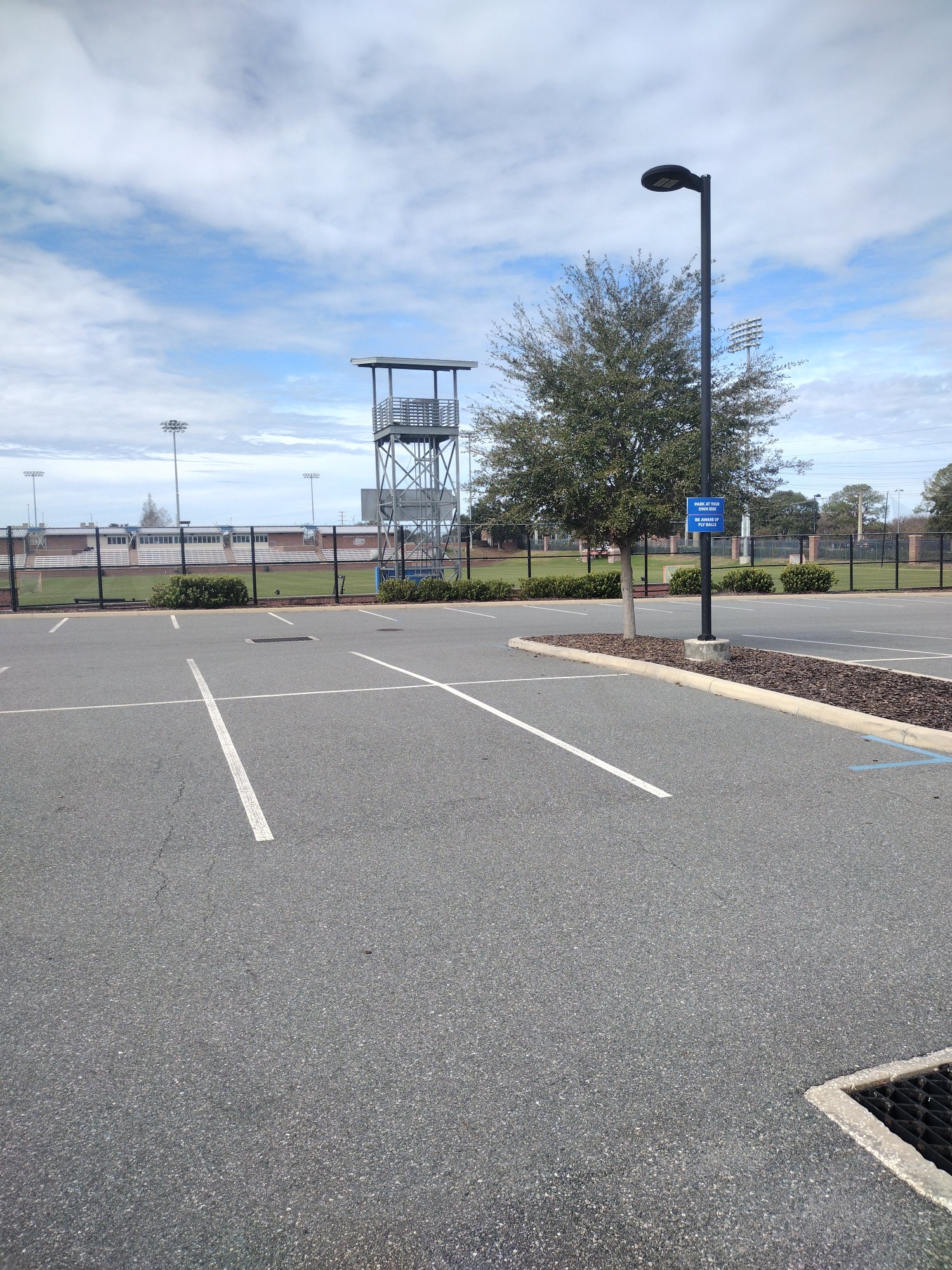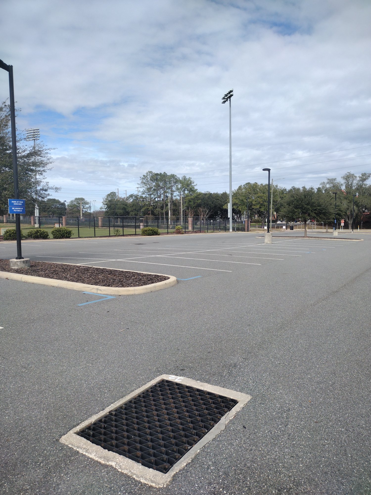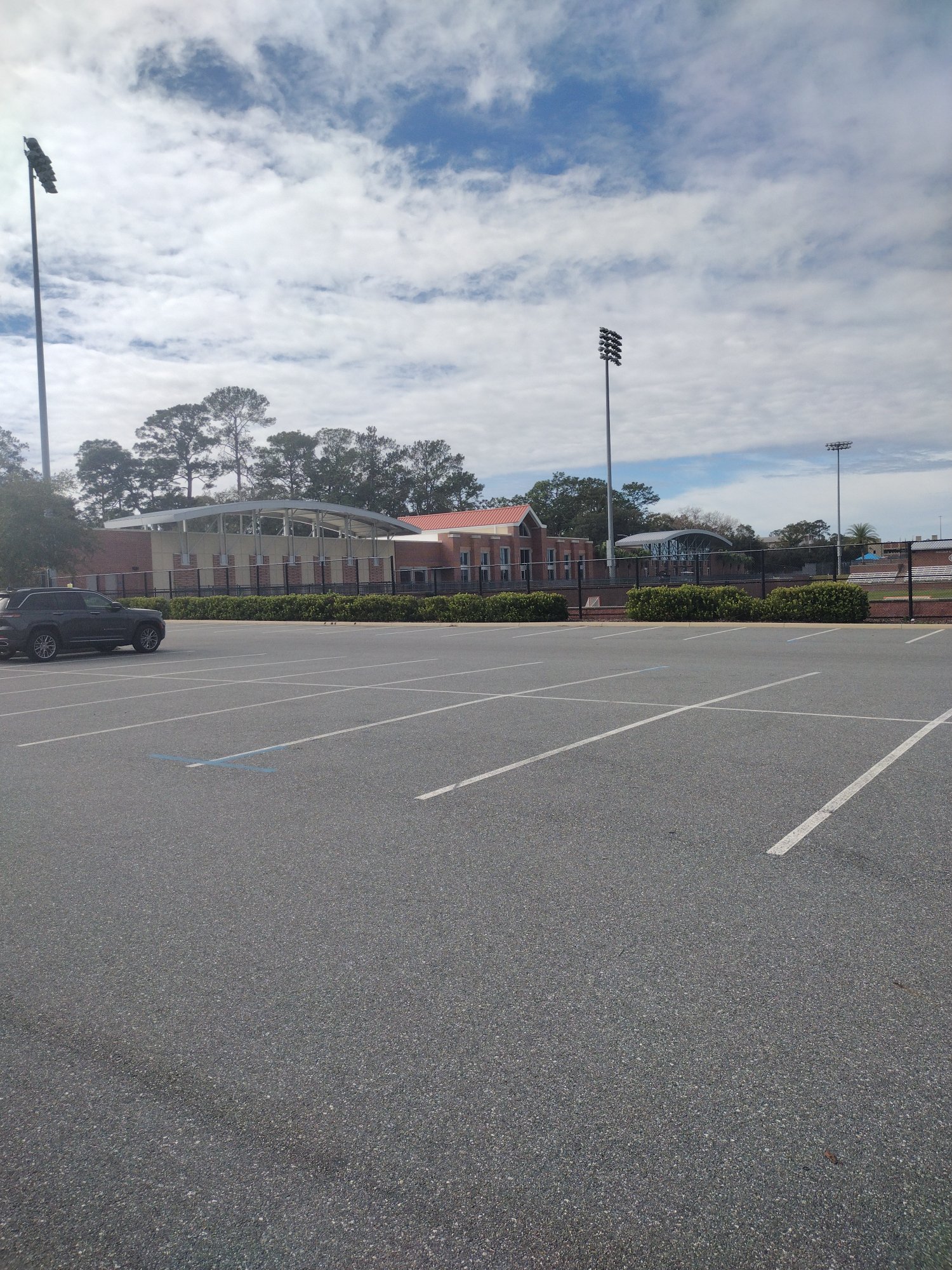 The lines were not finished toward the stop sign. The crosswalks were done, yet not the yellow lines. Tens of thousands of people use that area every Spring semester because of the sporting events.