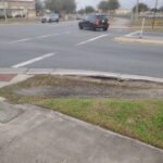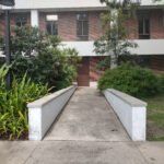 There are cracks and indentions in the sidewalk behind the University Auditorium. There is a lot of foot traffic around that building when there are events held there.